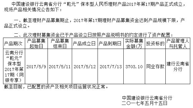 中国建设银行云南省分行“乾元”保本型人民币理财产品2017年第17期成立公告