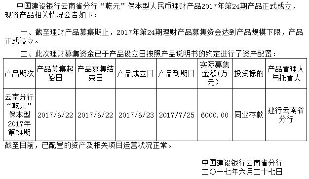 中国建设银行云南省分行“乾元”保本型人民币理财产品2017年第24期成立公告