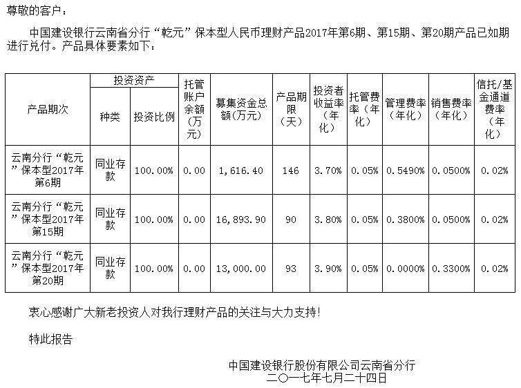 中国建设银行云南省分行“乾元”保本型人民币理财产品清算报告