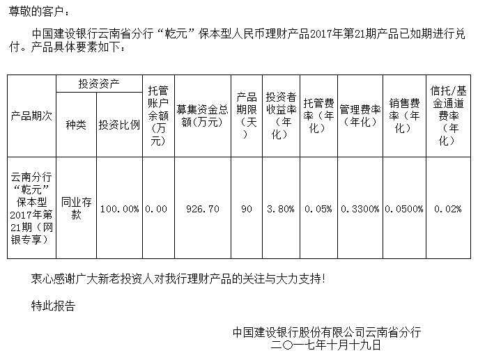 中国建设银行云南省分行“乾元”保本型人民币理财产品清算报告