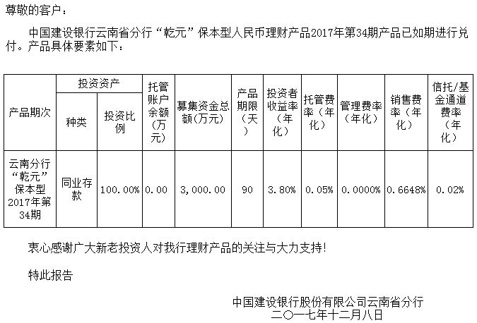 中国建设银行云南省分行“乾元”保本型人民币理财产品清算报告