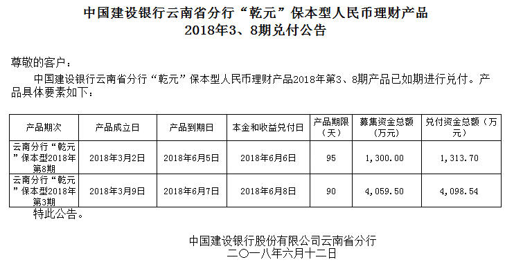 中国建设银行云南省分行“乾元”保本型人民币理财产品2018年3、8期兑付公告