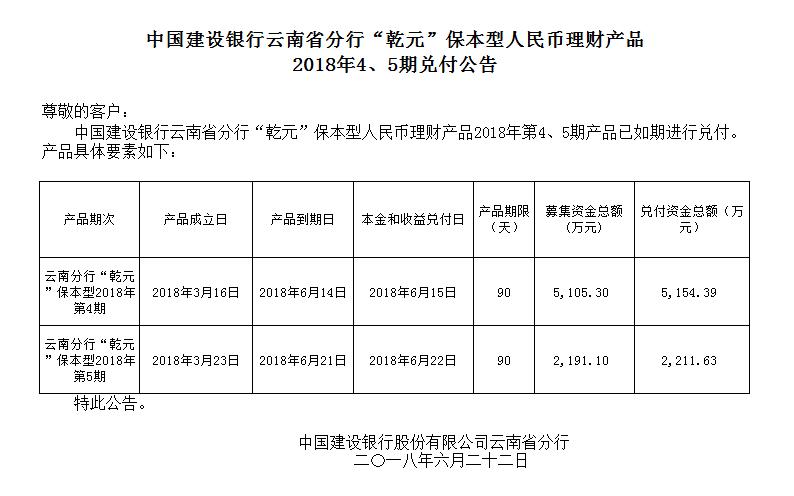 中国建设银行云南省分行“乾元”保本型人民币理财产品2018年4、5期兑付公告